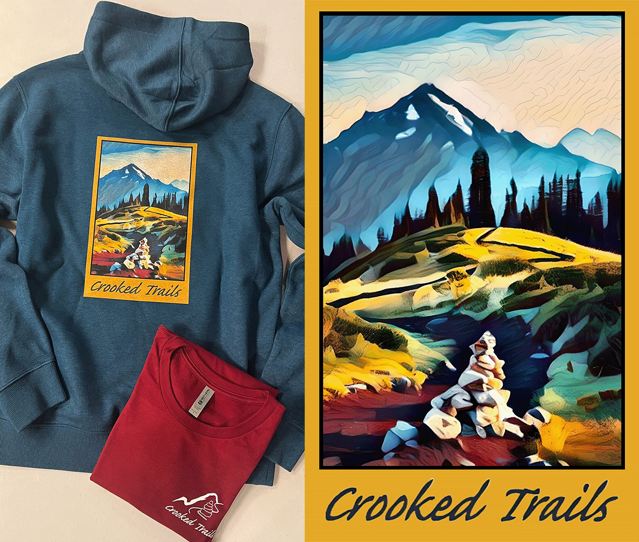 Add purpose to your purchase with the new Crooked Trails image, now offered on soft cotton-blend shirts and hoodies.